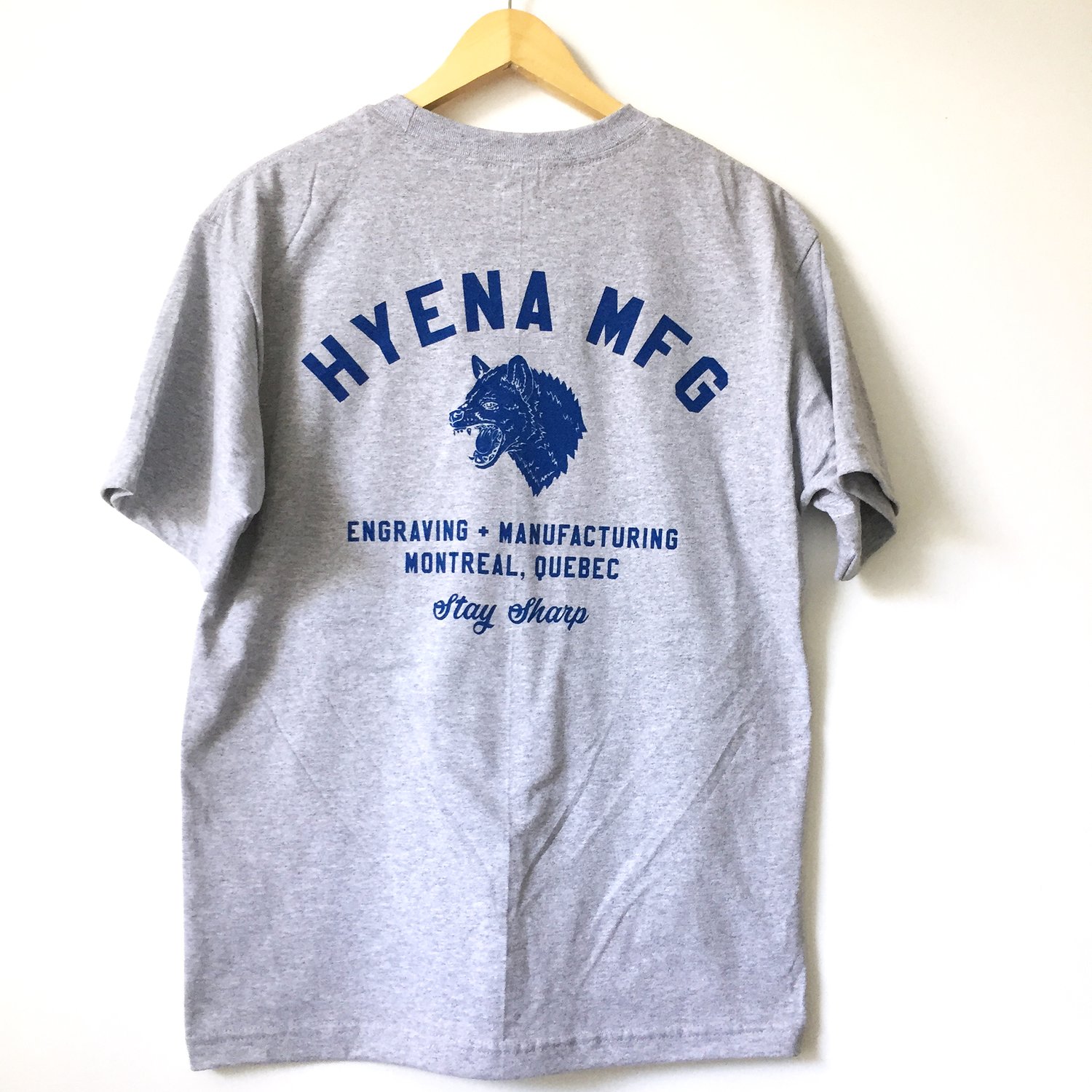 Hyena Mfg doesn't have a shop or a storefront, but if we did, this would be the sign that would hang over it. Navy blue waterbased ink design on a grey, heavy, 100% cotton T-shirt. Large logo design on the back and a one on the chest. This print is made with waterbased ink, which means not only is it better for the environment when printing, but the design is soft to the touch and gets softer every time it's washed.